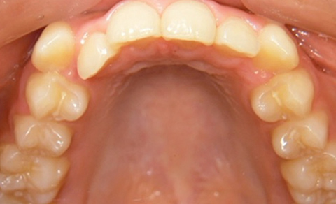 | 治療詳細 | 患者様は、歯のガタガタと並ぶスペースの不足を主訴として来院されました。治療として、ポーターを用いて上顎を拡大し、歯の生えるスペースを確保しました。特に2番の歯が口蓋側に生えており、反対咬合を伴っていたため、前方へ押し出して改善しました。今後は前歯の歯根の状態を確認してワイヤー矯正へ移行します。 |